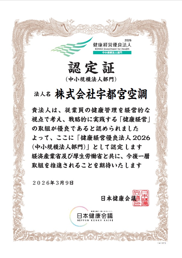 株式会社宇都宮空調は、従業員の健康管理や働きやすい職場づくりに取り組む企業として、「健康経営優良法人2026(中小規模法人部門)」に認定されました。今後も社員の健康を第一に考え、持続可能な企業成長を目指してまいります。